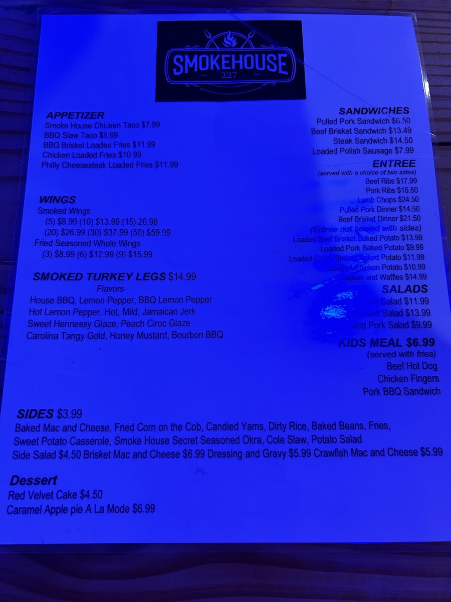 From a reviewer’s perspective, the menu at Smokehouse 227 delivers a satisfying and well-rounded Southern barbecue experience that feels both indulgent and thoughtfully curated. Starting with the appetizers, options like the Smoked House Chicken Taco, BBQ Slaw Taco, and the indulgent BBQ Brisket Loaded Fries, Chicken Loaded Fries, and Philly Cheesesteak Loaded Fries immediately set the tone with bold flavors and hearty portions. Wing lovers will appreciate the flexibility of the Smoked Wings (5), Smoked Wings (10), Smoked Wings (15), Smoked Wings (20), and Smoked Wings (30), making them perfect for both solo diners and groups.